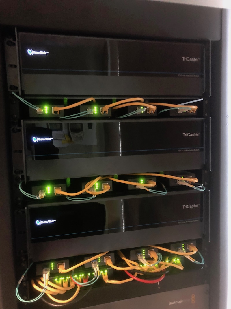 Three TriCaster TC1’s connected to cameras via NDI in each courtroom. Minimal space and cabling required, every two TC1’s act as backups to the other one. NDI drastically reduces the amount of cabling required using the building’s local area network to transmit video signals.