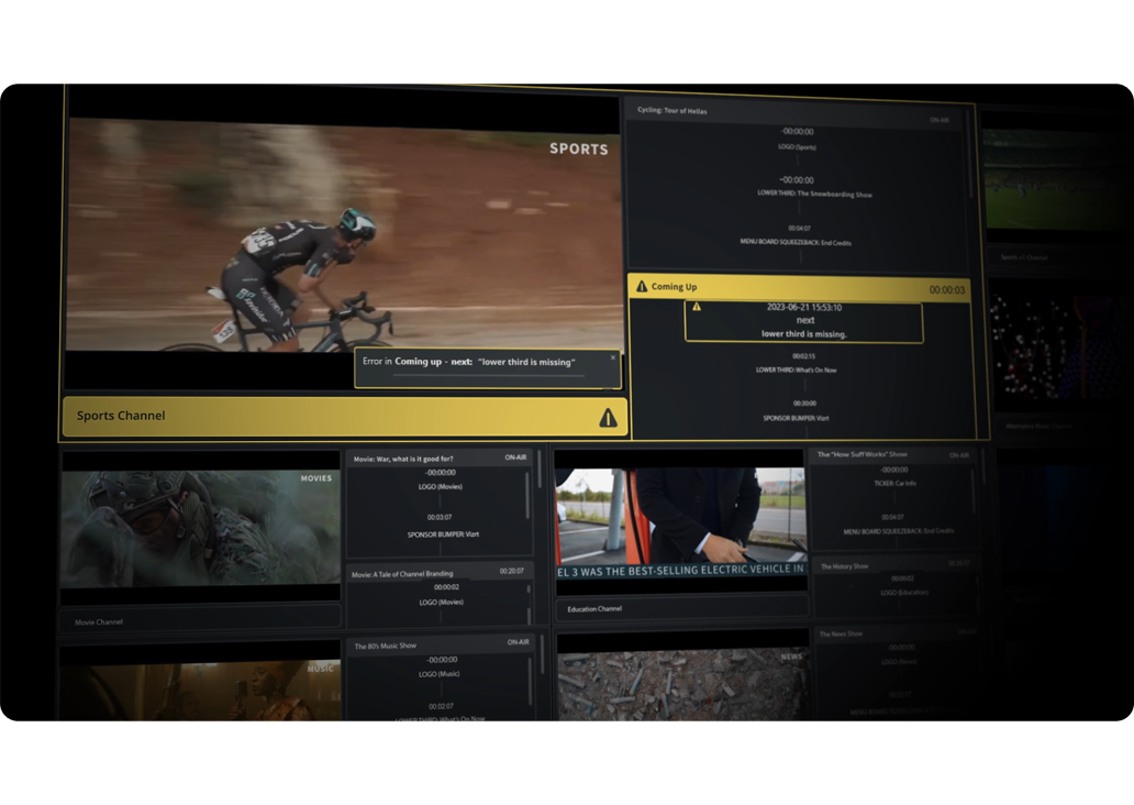 Keep viewers engaged during ad breaks and transitions by automatically displaying what’s coming up next and what’s playing on related channels. Viz Channel Branding updates these on-air graphics instantly when schedule changes occur, ensuring your audience is always informed and less likely to switch away.
